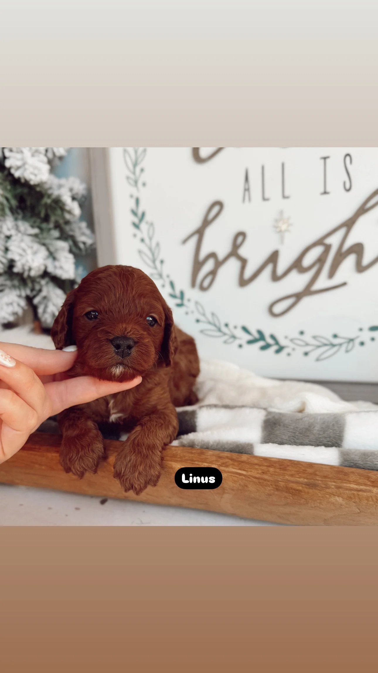 Linus is a cavapoo male, he is out of Ruby/Jockey. He is charting to be about 12lbs full grown and has a full thick soft wavy non shedding coat