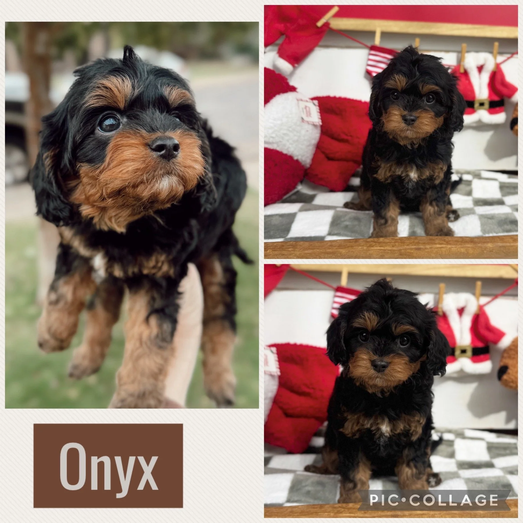 Onyx is such an amazing little guy!! He is charting to be about 10lbs full grown. He is a F1 cavapoo- so 50/50 cavalier/poodle generation. He is from Luna/Rollo litter. He shouldn’t shed and has such a thick nice wavy soft coat.